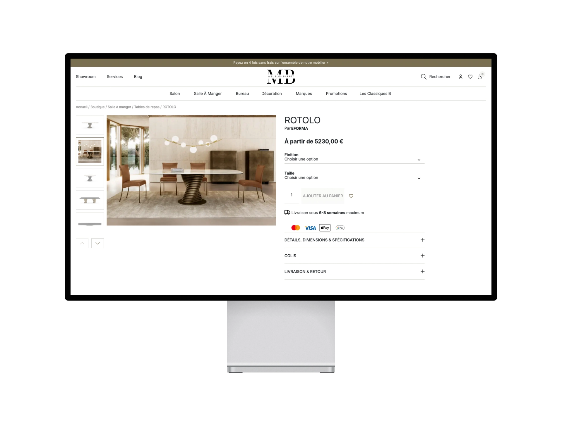 Le site devait offrir une navigation fluide et hiérarchisée : une page Maison pour ancrer l’histoire, des collections mises en scène par univers, une rubrique Services (conseil, personnalisation, livraison) et un contact pensé pour convertir sans friction. Les visuels ont été traités comme de véritables photographies d’édition, avec des cadres généreux, une lumière homogène et un cadrage qui valorise les détails. Sur mobile, l’expérience reste rapide et lisible, avec des interactions sobres et un temps de chargement optimisé.